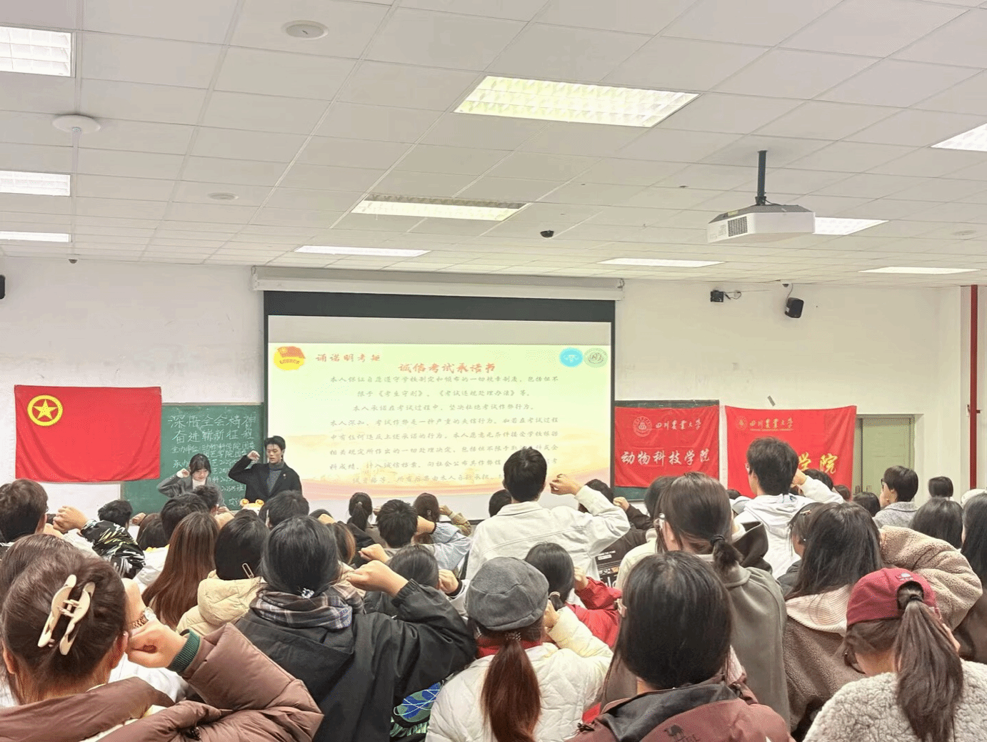 “诵诺明考矩,宣誓守诚真”。主持人带领青年团员宣读誓言,激昂的誓言回荡在活动会场,这不仅是对考试规则的郑重承诺,更是对恪守青春品格、锤炼高尚情操的庄严宣誓。随后,团员青年们现场签署了诚信考试承诺书,将诚信应试的外在要求内化为青年的价值观念,培育诚实守信的品格底色,为青年成长发展筑牢道德根基。