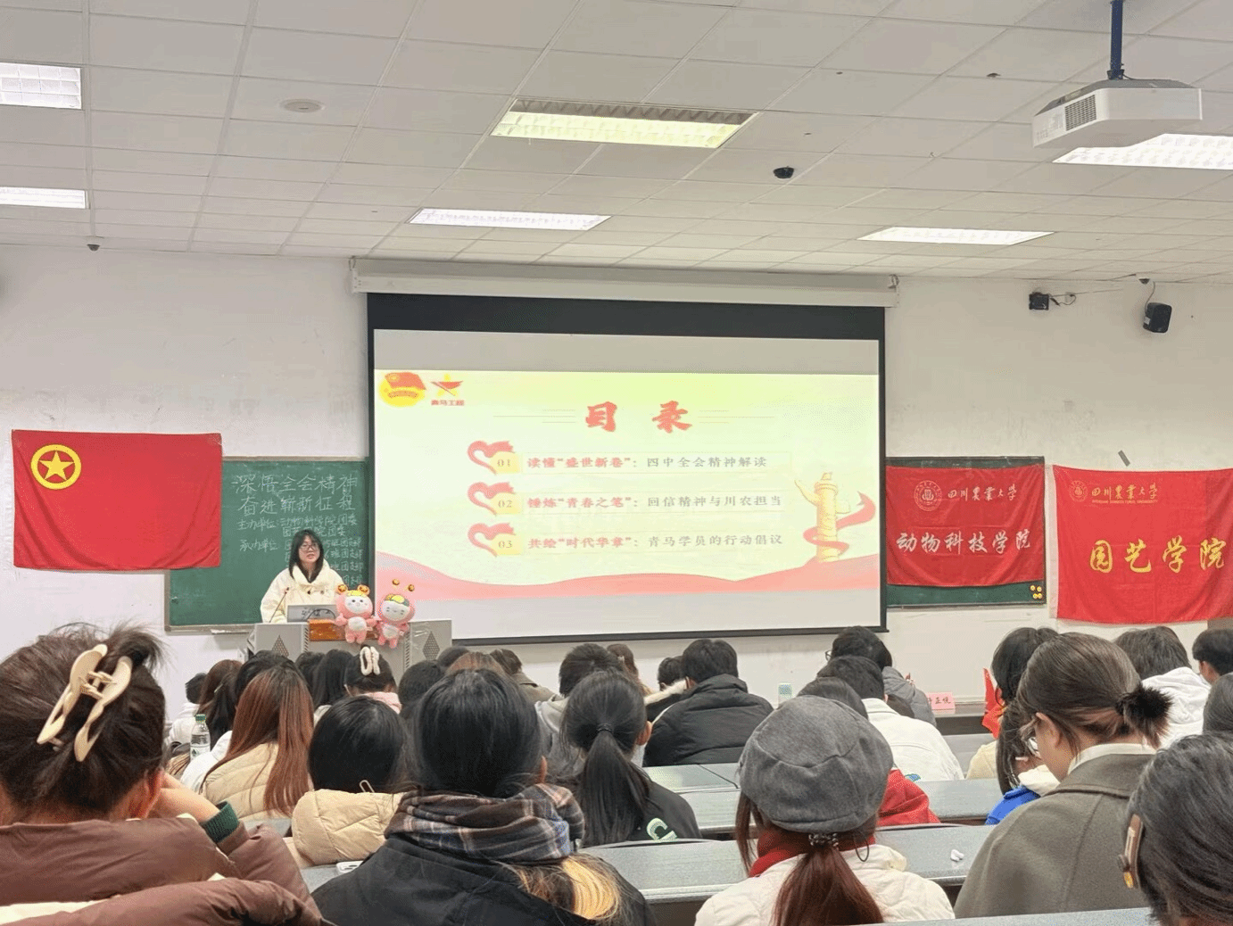 为深入学习贯彻习近平总书记在党的二十届四中全会上的重要讲话精神,引导广大团员青年深刻领悟全会提出的重大战略部署,进一步坚定理想信念、厚植家国情怀、勇担历史使命,奋力书写为中国式现代化挺膺担当的青春篇章。人生就是博ag(中国区)·公司官网团委直属部门流动团支部、园艺学院团委直属部门流动团支部、动科202501班团支部、动科202505班团支部、园艺202505班团支部、园艺202506班团支部于4-A105联合开展“深悟全会精神,奋进崭新征程”的主题班团活动。本次示范性班团活动分为五个篇章展开,吸引了180名团员青年积极参与。
